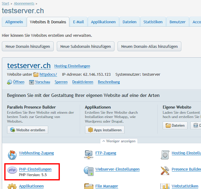 Klicken Sie dazu auf den Einstellungspunkt "PHP-Einstellungen" in der Registerkarte "Websites & Domains":