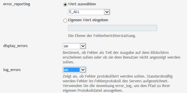Wenn Sie zum Debuggen die Fehler angezeigt bekommen möchten, müssen Sie folgende Einstellungen vornehmen: